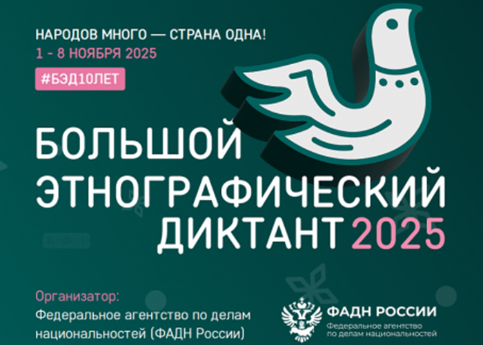 С 1 по 8 ноября 2025 года в тестовом режиме в формате онлайн в рамках Всероссийской просветительской акции состоится «Большой этнографический диктант». Ссылка для прохождения Диктанта в информационно-телекоммуникационной сети «Интернет» - http://miretno.ru/ (выбрать вкладку «Пройти Диктант»).