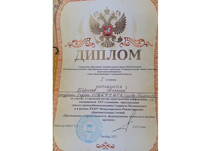 23 октября 2025 года в стенах Университетского лицея города Димитровграда состоялась городская научно-практическая конференция, посвящённая памяти святого преподобноисповедника Гавриила Мелекесского. Мероприятие прошло в рамках ежегодных XXXIV Международных Рождественских образовательных чтений на тему «Просвещение и нравственность: формирование личности и вызовы времени».